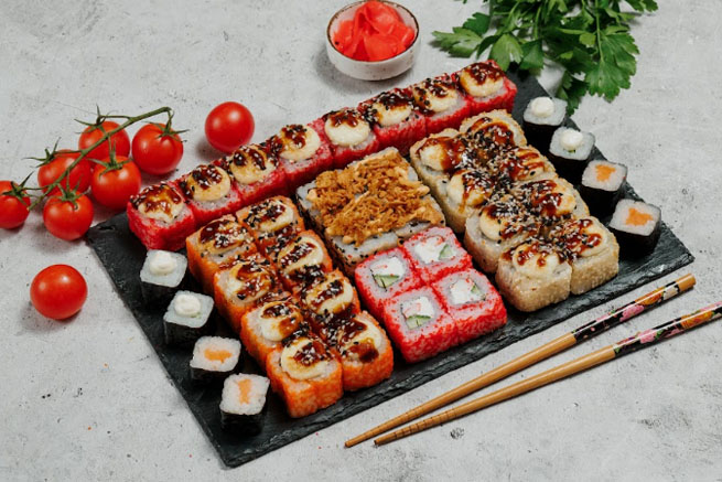 В состав входят: соевый соус 2 шт., имбирь 2 шт., васаби 1 шт., палочек 5 шт.