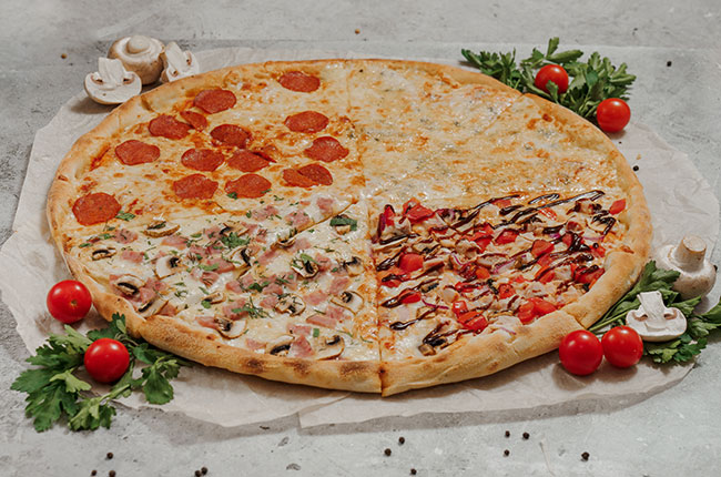 Состав: Состав: 1,4 пиццы 4 сыра, 1,4 пиццы Пепперони, 1,4 пиццы Барбекю, 1,4 пиццы Ветчина и грибы