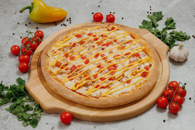 Курица копченая, помидоры, сыр Моцарелла, сыр Гауда, соус сырный.